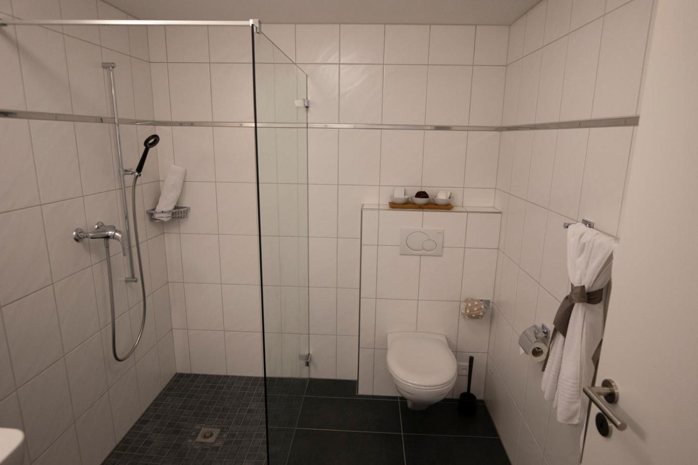 Double Room. The double room provides a wardrobe, as well as a private bathroom featuring a walk-in shower. Rooms on the upper floors are reachable by lift. ;