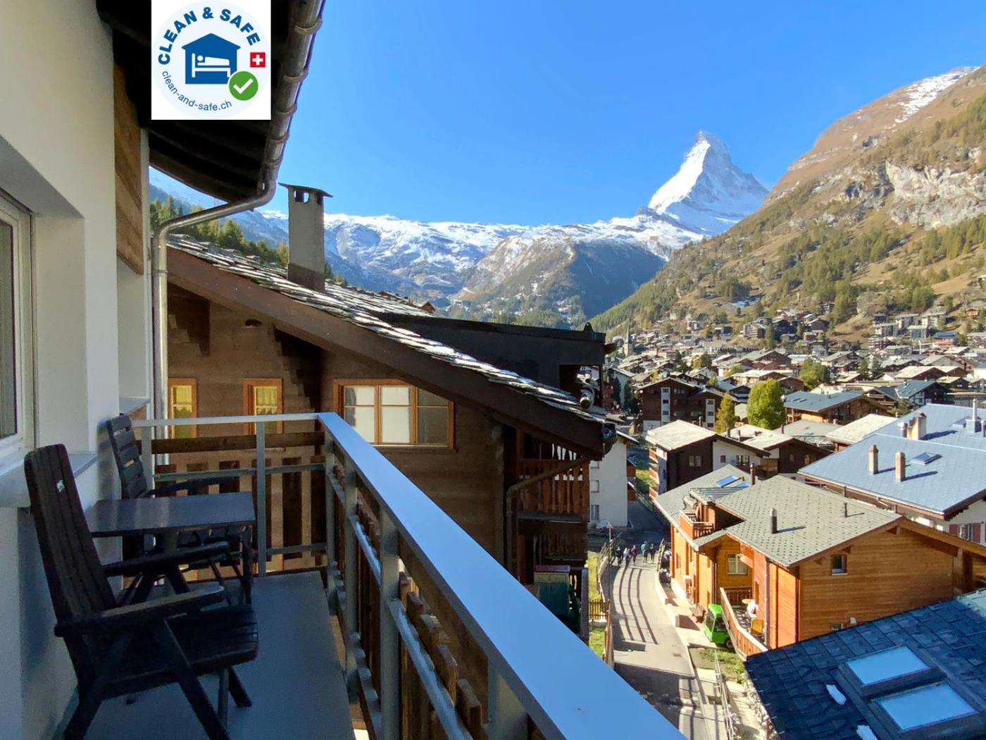 Studio with Balcony and Matterhorn View - No. 14. This studio offers a balcony with Matterhorn view, 2 wall beds, a seating area, cable TV, a fully equipped kitchenette with microwave or stove, fondue and raclette dishes, and a bathroom with shower or bath tub.
